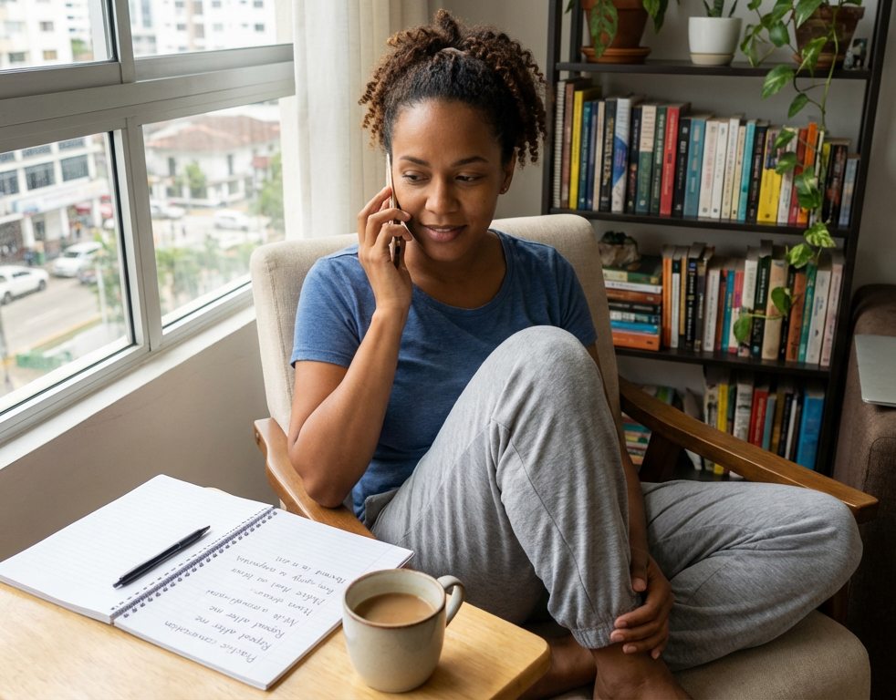 Una mujer adulta de unos 30 años, en una sala luminosa de un departamento en Lima, Perú, mira por la ventana con una chaqueta en la mano. Dice: “I want to go out”. Un hombre en la misma habitación responde: “Where do you want to go?” La escena es cotidiana, cálida y real.