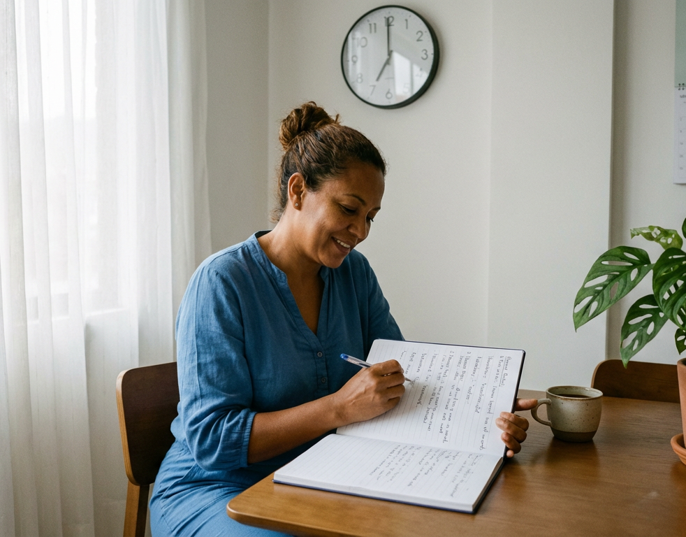 En una cocina sencilla de un apartamento en Quito, Ecuador, una mujer en bata de casa se sirve café y dice: “I want coffee”. Su pareja le pregunta desde la mesa: “Do you want sugar?” La escena es tranquila, con luz matutina entrando por la ventana.