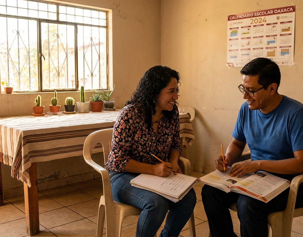 Una mujer adulta, de unos 40 años, en una cocina modesta en Oaxaca, México, con luz natural, toma un vaso del estante mientras un hombre le dice: “I need a glass of water”. Ella asiente y se lo pasa. Ambos visten ropa de casa sencilla. Se ve una jarra de agua y frutas sobre la mesa. Ambiente familiar, educativo y tranquilo.